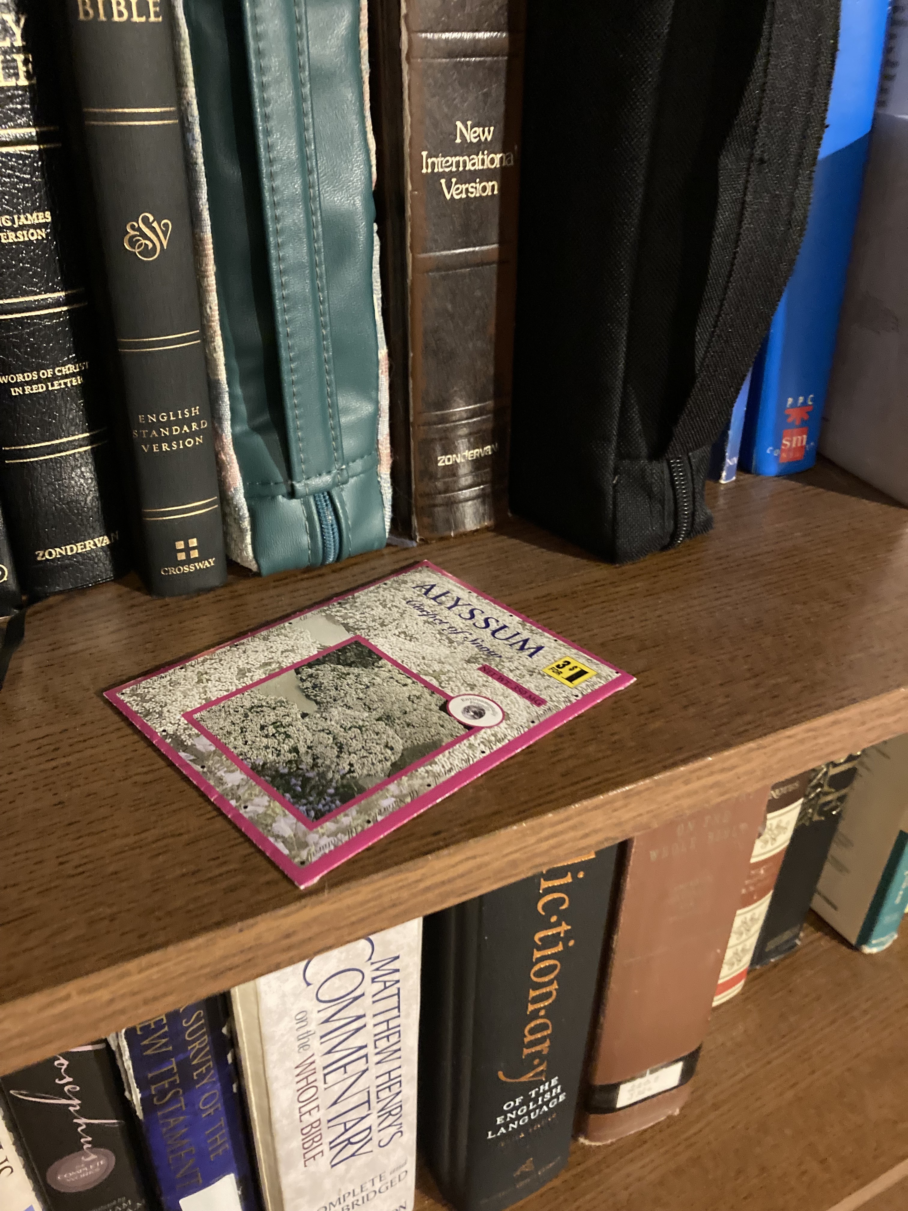 Well, I thought about Bible passages that compare God’s Word/Scripture to “seed” (Luke 8:11; 1 Pet. 1:23; James 1:21). And it seemed a sad irony that both my Bible and the seed packet were just sitting there, neither being planted. Over time, it became a ripe metaphor (no pun intended) of how God’s word really does nothing if it’s not planted in our heart. So I’ve left the packet of seed there as a sort of prophetic reminder of this sobering warning. But I’ve been picking up the Bible and trying to let that grow in my heart.